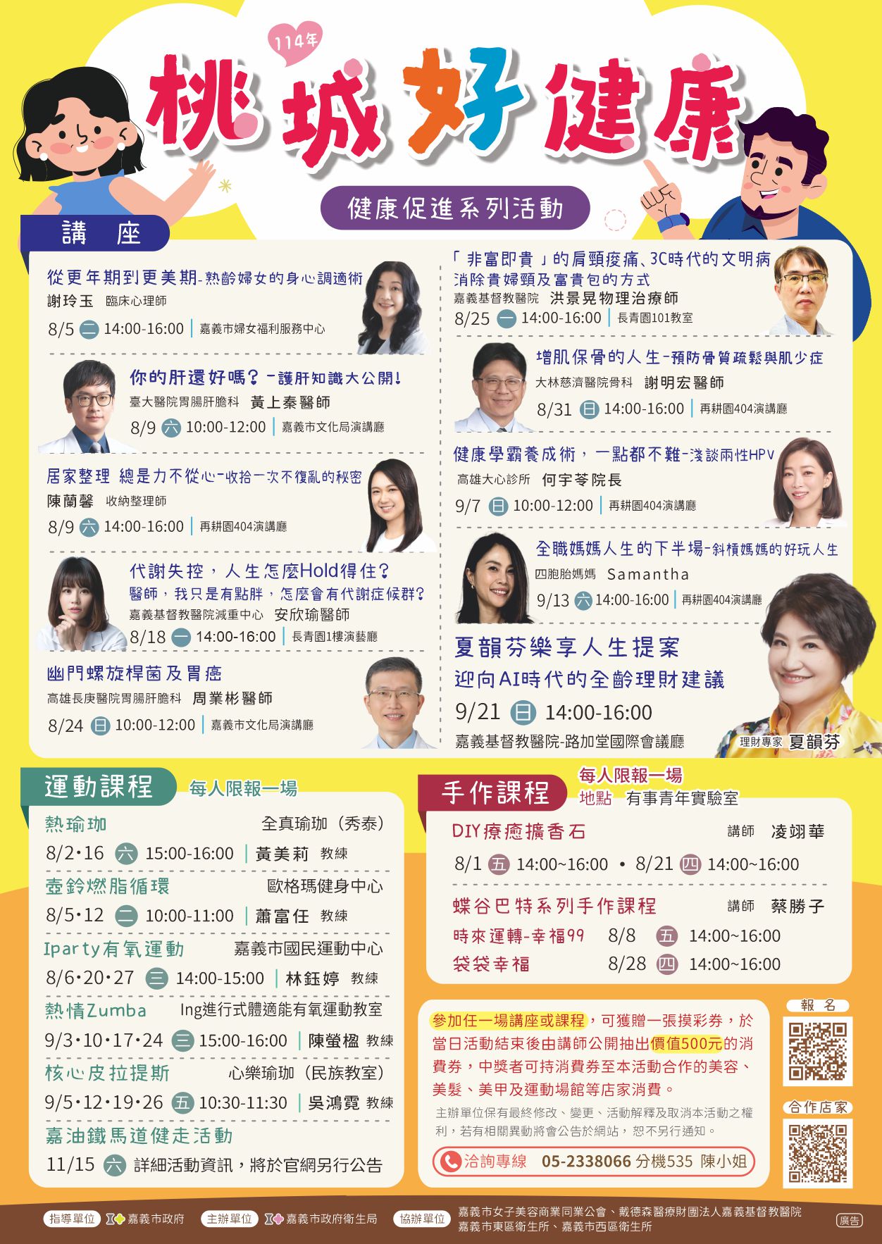 114年「桃城好健康」健康講座其他場次資訊,歡迎至嘉義市政府衛生局官網查詢,或洽衛生局國民健康科吳小姐,電話:(05)233-8066轉525。